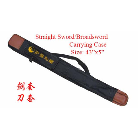This sword/broadsword carrying case is made of canvas, zipper closure, with an adjustable shoulder strap on the back. It can carry a sword or a broadsword up to 43" total length. the width of it is 5". Chinese characters "Chinese Wushu" and a Yin & Yang are printed on the front.